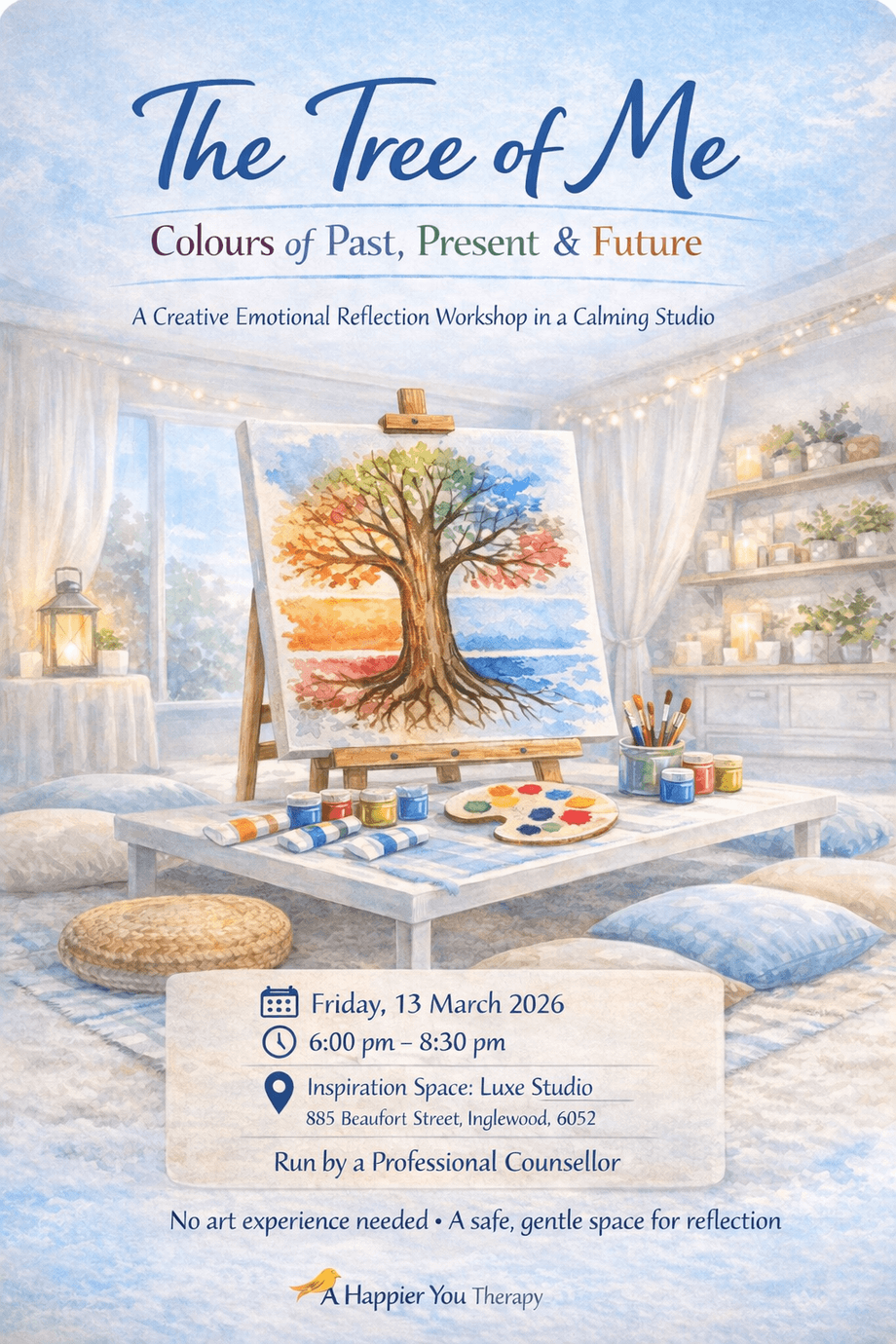 The Tree of Me is a guided reflective painting workshop designed to support emotional awareness, mindfulness, and self-connection through a gentle, creative experience. It offers space to pause, reconnect, and explore your emotions in a calm and supportive setting by a professional counsellor.